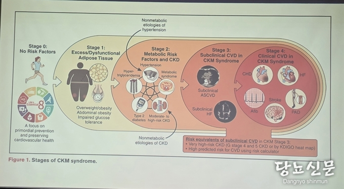 이어 한국인의 대사질환 유병률과 신장·심혈관질환 발생 양상을 반영한 단계별 위험도 재정의 내용도 소개했다. 발표에 따르면 CKM 증후군은 정상군인 0단계부터 과다 지방조직 및 대사 이상이 나타나는 1단계, 대사 위험요인과 고위험 만성콩팥병이 포함되는 2단계, 무증상 심혈관질환 또는 초고위험군인 3단계, 임상적 심혈관질환이 확인되는 4단계로 구분된다.