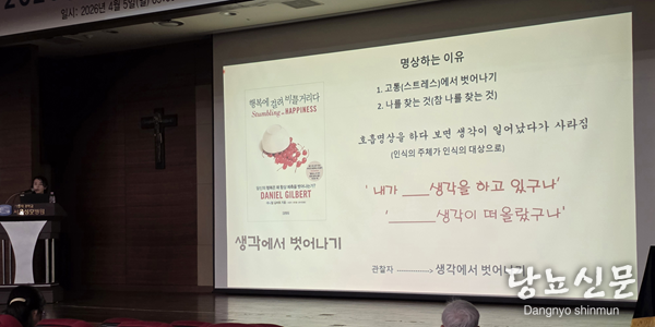 회장과 이홍식 강북삼성병원 교수가 좌장을 맡은 가운데, 이경희 한국자연치유요가협회 대표이사는 ‘명상기법으로의 자연치유 요가’를 주제로 강연했다. 이 대표는 명상을 통해 고통과 스트레스를 완화하고 자신을 돌아보는 과정을 소개했으며, 현장 참석자들과 함께 명상요법을 직접 진행했다.