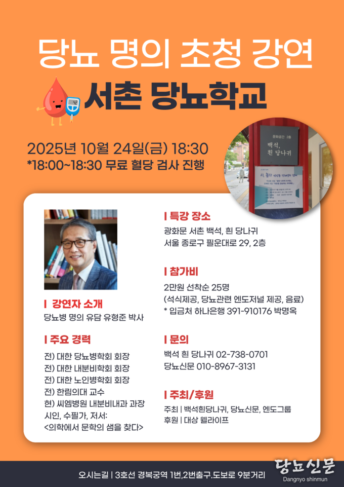 박미산 시인이 운영하는 백석, 흰당나귀에서 가을을 맞이하여 나와 내가족의 건강한 삶을 위한 건강 프로그램인 서촌 당뇨학교를 당뇨병의 명의 유형준 박사의 초청강연을 준비하였다. 장소가 한정되어 선착순으로 진행할 것이라 하였다.