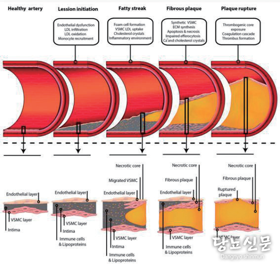 질병이 진행됨에 따라 평활근 세포는 배질에서 혈관 내 막으로 이동하여 증식하며 세포외 기질 성분을 분비합니다. 이로 인해 fatty streak 위에 섬유성 캡이 형성되고 플라크 가 성숙 하게 된다 . 고혈당은 최종당화산물(AGE) 형성하 고 수용체와 상호작용하여 산화 스트레스, 염증, 혈관 석회 화를 촉진함으로써 이 과정을 강화하게 된다(5). 이후 플라 크가 파열되면 혈전형성이 발생하게되며 혈관 내강의 좁아 짐과 혈전성 사건으로 치명적인 심혈관질환의 발생을 초래 한다<그림1>.