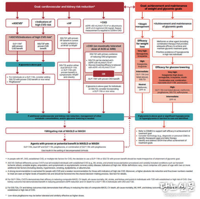이에 따라 그후에 개발된 SGLT-2 inhibitor 와 GLP- RA, GLP-1/GIP 수용제 작용제등이 이러한 과정등을 의무 적으로 거치면서 심혈관안정성에 대한 임상시험을 하게되 었고 안정성뿐만아니라 기대치 않았던 뛰어난 심혈관보호 효과가 있다는 것이 밝혀졌다 이결과 최근 국내 및 국외 당 뇨 가이드라인에서 동맥경화성 심혈관질환이 있는 경우에 는 SGLT2억제제와 GLP-1 RA를 동등하게 1차약으로 권고 하고 있다<그림 2>.