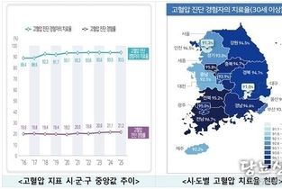 질병청, 8일 2025년 지역사회건강조사 결과 발표당뇨병 진단 경험률 9.6% “만성질환 관리 개선중” 올해 고혈압 진단 경험률은 21.2%로 30세 이상 성인 5명 중 1명은 고혈압을 진단받은 것으로 나타났다. 치료율은 93.5%로 전년과 동일했다. 질병관리청(청장 임승관)은 8일 청주 오스코에서 ‘2025년 지역사회건강조사’의 결과를 발표했다. 지역사회건강조사는 매년 전국 258개 보건소가 지역주민의 건강실태를 파악하고, 지역보건의료계획의 기초자료로 활용할 수 있도록 2008년부터 시‧군‧구 단위의 건강통계와 지역 간 비교통계를 생산하고 있다. 발표에 따르면 올해 시‧도별 고혈압 치료율은 울산이 90.4%로 가장 낮았고, 대구 91.0%와 서울 91.3%로 뒤를 이었다. 전남이 96.7%로 가장 높았으며, 세종과 전북이 각각 95.8%와 95.2%로 높은 수준을 보였다. 당뇨병 진단 경험률은 9.6%로 30세 이상 성인 10명 중 1명은 당뇨로 진단받았다. 치료율은 93.2%로 전년 대비 0.2%p 감소했다. 당뇨병 합병증 예방을 위한 신장질환 합병증 검사 수진율은 2025년 51.8%로 전년 대비 1.7%p 증가했다. 최근 10년간을 보면 2016년 3